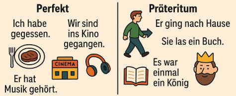 - tvorba: pomocné sloveso haben/sein vyčasované v přítomném čase + Partizip II (příčestí minulé)