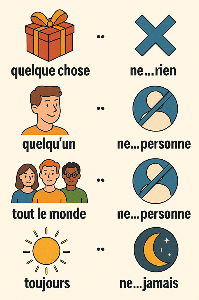 - tvorba: ne + sloveso + jamais/rien/personne/plus