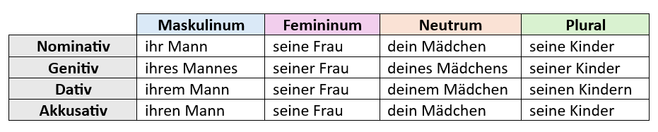 - člen neurčitý: ein, eine -> stejně jako člen neurčitý se skloňují i přivlastňovací zájm. (mein, dein, ...)